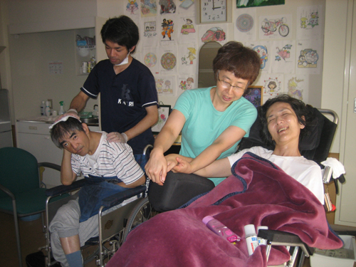 グループ2はテーマや目的を共有しながら、AとBの二つの班にわかれて活動しています。アロマの匂いをかぎながら音楽を聴いたり、手足のマッサージ、散歩などなど・・・。